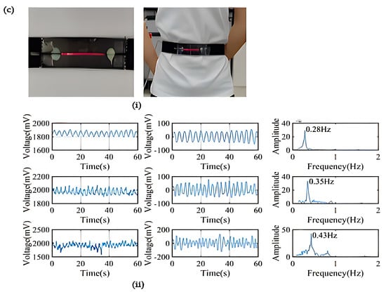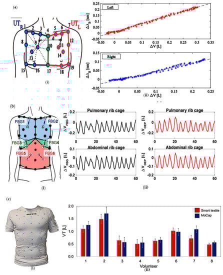 (a) Schematic diagram of chest breathing monitoring (i) and correlation between FBG wavelength change and UT volume (L) (ii) []; (b) schematic diagram of thoracoabdominal breathing monitoring (i) and FBG volume (L) change (ii) []; (c) the schematic diagram of chest and abdomen respiratory monitoring (i) and the VT value calculated by smart textile are compared with the VT value collected by motion (ii) [].
