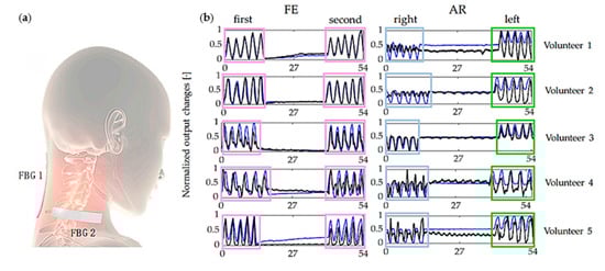D. Lo Presti’s team first combined neck motion monitoring and respiratory monitoring to achieve the monitoring of two parameters with one device [] (Figure 3a). It is composed of two flexible sensors based on FBG Technology. Each sensor encapsulates an FBG in a rectangular matrix made of silicone rubber. The use of polyacrylate bandages can better adhere to and conform to the skin. This bandage has viscosity, elasticity, and high permeability; breathing can be monitored through neck muscle activity and chest junction movement. During the tests, the participants performed five repetitions of flexion, extension, and axial rotation and ten repetitions of profound and rapid breathing. The output variations of the wearable device and the motion capture system collected during the flexion-extension (FE) and axial rotation (AR) repetitions are shown in Figure 3b. The system performs well in monitoring the aforementioned parameters compared to the motion capture system. All signals involved in peak detection for breath analysis are depicted in Figure 3c,d. The output variations of each volunteer, collected by the flow meter and FBG, are displayed during quiet and rapid breathing. The wearable system effectively captures the temporal trends of neck movements (flexion, extension, and axial rotation). It accurately estimates the average breath rate and breath rate values for both quiet breathing and rapid breathing. The percentage errors are 6.09% and 1.90%, respectively.