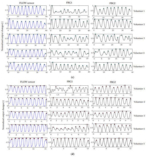 The shoulder neck monitoring structure diagram (a) and the output changes of wearable (black line) and motion capture (mobcap) systems (blue line) collected during shoulder neck up, down, left, and proper repetition (b). The flowmeter (blue line) and FBG (black line) are the signals collected by each volunteer during quiet breathing (c) and rapid breathing (d) [].
