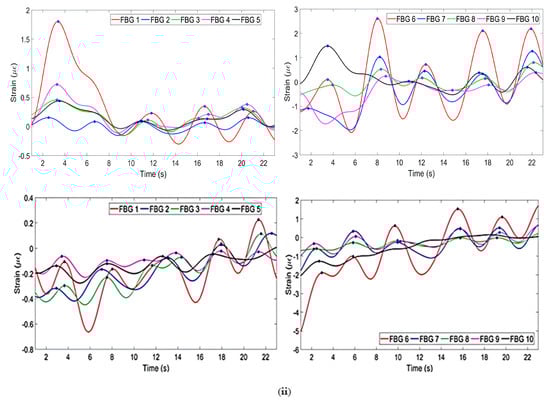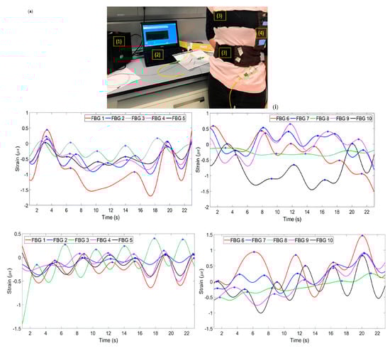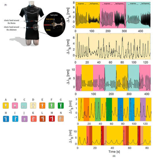 (a) Schematic diagram of thoracoabdominal breathing monitoring and 5 FBGs of the chest (i) and abdomen (ii) detected strain patterns under four states of standing, sitting, lying down, and running []; (b) schematic diagram of thoracoabdominal breathing monitoring (i) and strain detected by FBG under various postures [] (ii).