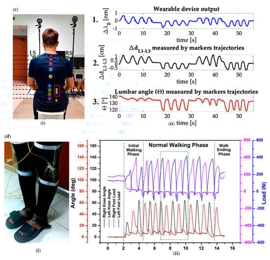 (a) Schematic diagram of elbow joint monitoring (i) and the relationship between elbow angle and Bragg wavelength displacement before and after movement (ii) []; (b) schematic diagram of knee joint monitoring and kind response during walking (i), enlarged image of a gait cycle (ii) []; (c) lumbar monitoring schematic diagram (i) and wearable output , distance between L1 and L3, lumbar angle obtained according to e θ trend (ii) []; (d) gait monitoring diagram (i) and simultaneous response of kids and fluids during walking (ii) [].