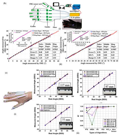 (a) Structural diagram and dynamic response of FBG sensor in the range of 0–19° (i) and 13°–35° (ii) compared with IMU []; (b) structure diagram (i) and angle results measured by MCP joint (upper) and PIP joint (lower), FBG sensor and IMU sensor (ii) []; (c) structure diagram (i) and the length of measured angle and actual angle (measured by goniometer) relative to index finger: 117 mm, 97 mm, 77 mm. Measure the linearity of the MCP joint angle according to the algorithm and finger length (ii) [].