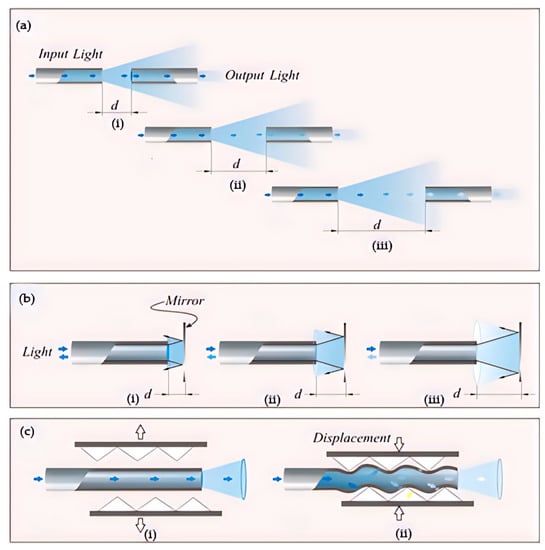 (a) the principle of changing light intensity is changing the distance between two optical fibers and schematic diagram of the process of light passing through an optical fiber (i–iii); (b) changing the light intensity by changing the direct distance between the optical fiber and the mirror and schematic diagram of the process of light passing through an optical fiber (i–iii); (c) changing the light intensity principle by macro bending of optical fibers and schematic diagram of the process of light passing through an optical fiber(i,ii).