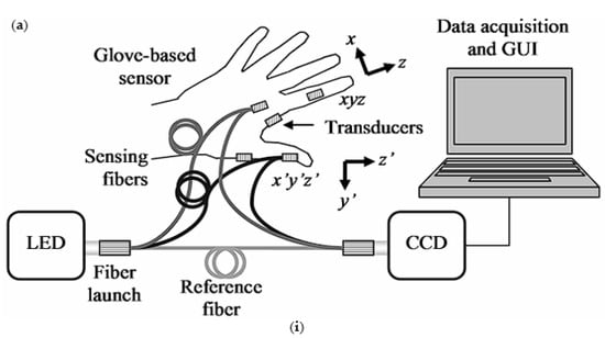 FBG gloves comprise ten FBG sensor units connected to the commercial Lycra spandex gloves [] (Figure 7b). The FBG sensor unit is constructed as follows. The optical fibers are secured inside the tube using cyanoacrylate adhesive. The spring fiber assembly is placed inside a 3D-printed tube with an inner diameter of 4 mm and a length of 34 cm. Five PVC foam strips are connected to the glove, and the sensor unit is properly fixed. The glove is sewn with a protective layer made of Lycra fabric. This minimizes the risk of damaging the FBG sensor unit during repeated glove wearing and removal. Building upon the previous design, a separator is implemented, allowing only the replacement of damaged FBG sensors. The device achieves a remarkably high angular resolution of 0.1° and compares the accuracy and repeatability of all ten glove sensors with the pure calibrated IMU sensors. This glove is superior to many sensor gloves reported earlier, with an average error of 0.80°. The standard deviation (1.01°) and range (2.60°) and the human–computer interaction between the sensing glove and the virtual VR platform have expanded the application of high-precision gloves. Jun Sick Kim’s team will use five FBG sensors to form a wearable glove module [] (Figure 7c). FBG strain sensors will be encapsulated in a rectangular epoxy resin matrix at an offset distance of about 53 µm from the neutral axis. The sensors are rectangular and 2 mm wide. Five FBG encapsulated sensors correspond to five fingers, respectively. Due to different finger lengths, nine nodes of the FBG sensors are used for the index finger, middle finger, and ring finger, respectively; the little finger has seven nodes; the thumb has five nodes. Unlike traditional wearable glove devices, FBG strain sensors move continuously according to the hand size and the joint’s curvature to achieve high-precision real-time calculation. Typically, four algorithms are proposed to measure the inclination angle, proximal interphalangeal (PIP) joint, and metacarpophalangeal (MCP) joint angle. The maximum and minimum angle errors of the index finger are 3.53° and 1.89°, respectively, which are applicable to dip joints, respectively; 3.15°and 1.85° for PIP joints, respectively; and 2.53° and 2.11° for MCP joints, respectively. For the thumb, the maximum and minimum angular errors are 2.56° and 2.02°, respectively, for the IP connector and 3.43° and 1.41° for the MCP connector. The maximum angular error of the MCP joint of the thumb is 1.01° and 2.42°, and the angle error of the other joints is small. The average error angle of the wearable, handheld module is 0.47° ± 2.51°, and the average absolute error (MAE) is 1.63° ± 1.97°. The results show that the angles of all finger joints can be measured with high accuracy, even for different hand sizes, and the measurement accuracy varies with the algorithm.