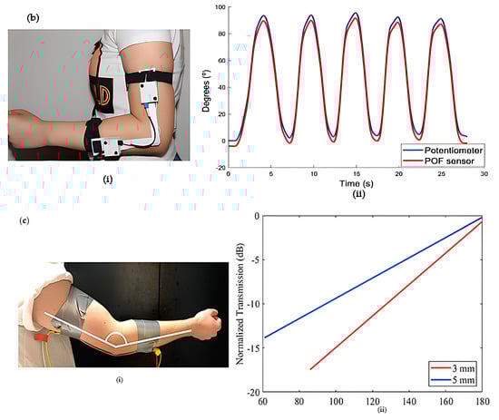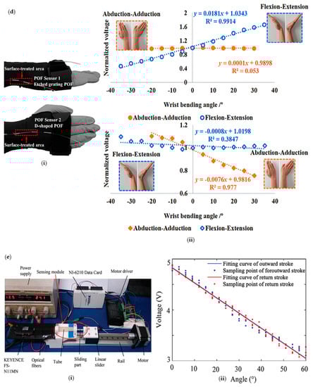 (a) Finger joint monitoring structure diagram (i) and sensor response to angular displacement change of finger joint (ii) []; (b) elbows joint monitoring structure diagram (i) and joint angle measurement results (ii). The blue line represents the potentiometer and the red line represents POF []; (c) wrist monitoring structure diagram (i) and measurement response of wrist flexion, extension, and abduction adduction motion (ii) []; (d) elbow joint monitoring chart (i) and average optical response of optical fiber during elbow bending of art (ii) []; (e) elbow and wrist joint monitoring chart (i) and output voltage increasing with carpometacarpal flexion angle (ii) [].