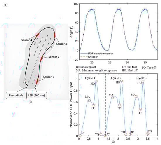 (a) Gait-assist structure diagram (i) and POF curvature response of knee flexion and extension cycle of modular exoskeleton (above), POF insole for functional electrical stimulation (FES) assisted-gait phase detection (below) (ii) []; (b) gait help structure diagram (i) and ground reaction force (GRF) and plantar pressure of female subjects weighing 46kg (above). The solid line is the average GRF, and the shadow curve is the standard deviation of 5 cycles; (below) GRF and plantar pressure measurements are standardized for all 20 participants. Solid lines represent the mean GRF and shaded curves represent the standard deviation (ii) [].