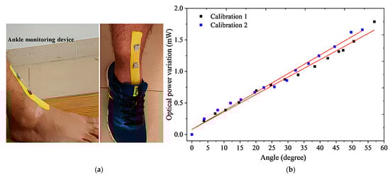 Wearable ankle monitoring device based on FPI (a) and optical power variation with angular displacement. Points are experimental data, and straight lines correspond to linear fitting (b) [].