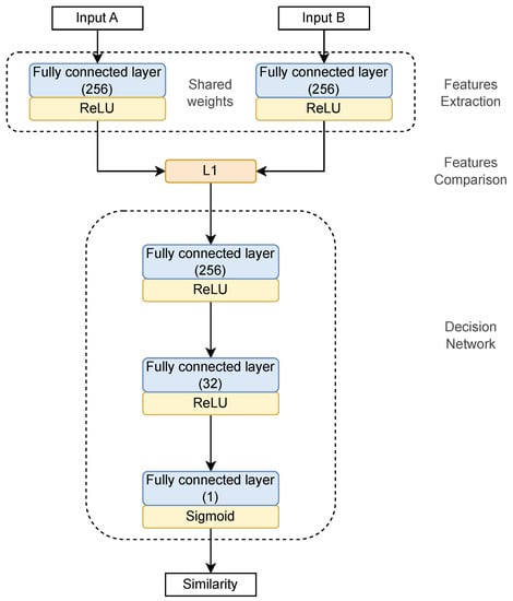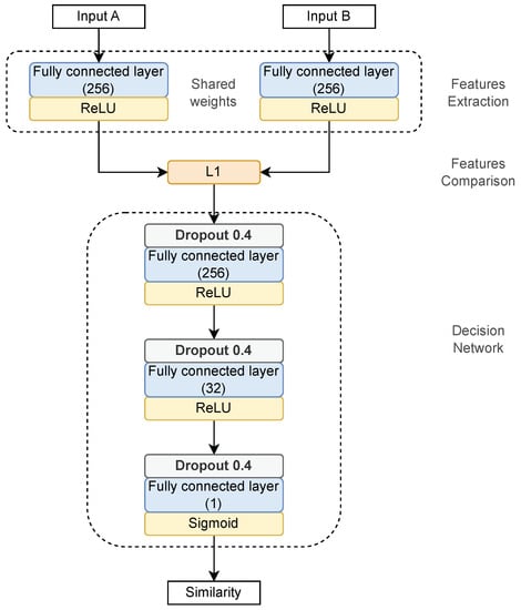 A Siamese neural network [22] comprises two or more identical artificial subnetworks with the same configuration, parameters, and weights. Both subnetworks work parallelly in tandem. Each is capable of learning the hidden representation of a given input sample. The distances between the outputs of these subnetworks are inputs to the decision network. Finally, the loss value is calculated for the decision network outputs. The loss function aims to minimize the intra-class distance and maximize the distance between samples from different classes. Hence, the output generated by a Siamese neural network execution can be considered the semantic similarity between the representation of the two input samples.