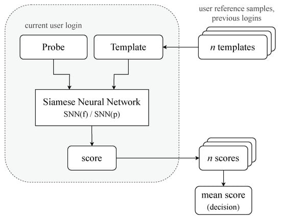 Siamese neural network architecture has already been used for keystroke dynamics-based authentication on full passwords and achieved good scores, as is presented in [4,16]. Therefore, we employed a Siamese neural network for user authentication on a partial password. We frame keystroke dynamics-based authentication as a binary classification problem. We calculate the similarity score of the assessed and previously collected user samples (time distances) to distinguish genuine and imposter users. Applying SNN and one-shot learning, only a few samples of data per class are sufficient to recognize the password owner. Moreover, it allows for limiting the number of trained models. The same model can be used for all users, and it does not have to be retrained with the appearance of new data (one-shot learning). To update a model after increasing the number of users, model parameters can be reused based on the similarity between the keystroke dynamics data of old and new users. In general, categories are first learned on numerous training examples, and then new categories are learned using transformations of model parameters from those initial categories.