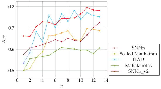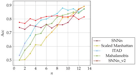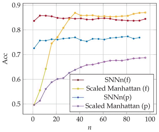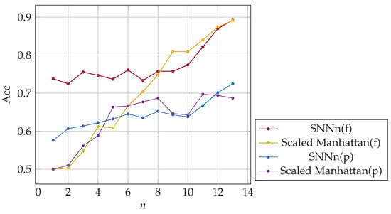 For each sample of a given user, we created a positive pair with subsequent sample of the same user and a negative pair with a random sample of another user entering the same password. It ensured that the “same” samples were created from keystroke dynamics more similarly. We trained and validated both SNNs on the new training dataset. We obtained new models, i.e., SNNn_v2(f) and SNNn_v2(p). Finally, we implemented these new network models in our n-shot classification algorithms. We evaluated both algorithms, i.e., SNNn_v2(f) and SNNn_v2(p), on the test dataset described in Section 7.1, and compared with original SNNn(f) and SNNn(p), and baseline methods. The results are presented in Figure 12 and Figure 13. New Siamese network models allowed us to achieve better accuracy in comparison to the original ones used in the experiments presented so far.