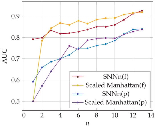 The metrics described in Section 5.3 were used for the performance evaluation of tested classifiers. False acceptance and rejection rates after three logins for full and partial-password-based authentication were as follows: FAR(f) = 0.25, FAR(p) = 0.32, FRR(f) = 0.28, FRR(p) = 0.36. The minimal equal error rate for SNNn(p) classifier was similar to once obtained for the validation dataset, ERR(p) = 0.3. In the case of full-password-based authentication, the value of ERR was worse w.r.t. the obtained for validation dataset, i.e., ERR(f) = 0.27. Hence the classification quality was slightly worse. The classification accuracy as a function of the number of past logins n used in the authentication procedure is presented in Figure 8, the area under the ROC curve (AUC) in Figure 9. Note that the user learns their password in the first few logins, and how they write it may change dynamically until the habit is established. Verifying a user after several logins is difficult due to user typing changes. Nevertheless, SNN(f) classification accuracy was about 74% after one login and 89% after twelve logins. The results of the SNNn(p) classifier were significantly worse but still outperformed the results of the baseline method, especially for a few previous logins. After twelve past logins, the classification accuracy was about 73%. Generally, the quality of classification both for SNNn(f) and SNNn(p) increases with the number of reference samples (logins) considered, and the potential for further growth can be seen.