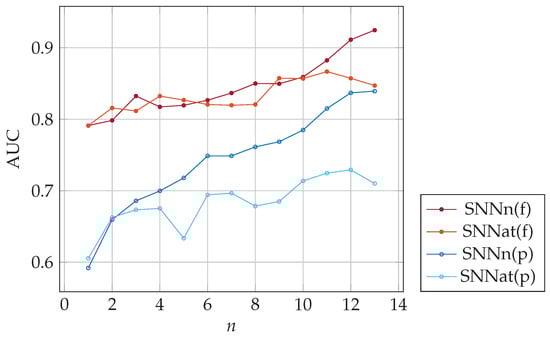 The classifiers SNNn(f) and SNNn(p) require n SNN model responses, which take some time. In the last series of tests, we evaluated another approach (SNNat), presented in Figure 10. During each user login, the dynamics of the password entry were compared with a template calculated as the average of the input data from n previous logins. Thus, the one-shot classification with an average template was employed. The comparative study of SNNn and SNNat classifiers is presented in Figure 11. It can be seen that SNNn-type classifiers give much better results. The area under the ROC curve (AUC) significantly decreases for SNNat and full-password-based authentication. The reduction in classification quality in authentication on partial passwords is significantly less, but the SNNn algorithm still gives better results than SNNat. In conclusion, we recommend the use of SNNn-type algorithms.