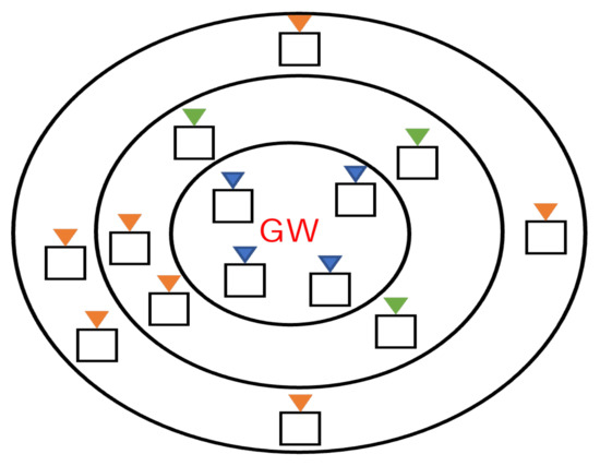 This paper considered the uplink transmission of a LoRa system with a star topology consisting of one GW and L LoRa devices. Denote as the LoRa device set, where denotes the l-th LoRa device. Assume that the number of available channels for the LoRa devices is I. The public ISM band of Japan was used for the communications between LoRa devices and the GW in this paper, where the bandwidth of each channel was 125 kHz, while at most 15 channels can be used for communication. We considered a natural wireless communication environment where LoRa devices are distributed in various locations with different distances from the GW, as shown in Figure 1. In Figure 1, the concentric circles are divided according to the distance from the GW. Different colors represent different SFs assigned to LoRa devices, which may need to be assigned according to the distance between the LoRa device and the GW. Assume that the number of SFs is S. Each LoRa device selects one SF and one channel to transmit packets each time. As described in Section 1, LoRa employs CSS modulation so that signals with different SFs (7-12) can be identified and successfully received even if they are transmitted simultaneously on the same channel. In addition, different SFs have different transmission speeds and thresholds for the SNR that can be successfully received. Therefore, each LoRa device must select an appropriate SF considering its distance to the GW and interference effects in the surrounding environment. Theoretically, the spreading codes for different SFs are orthogonal, so collisions only occur when two or more LoRa devices choose the same SF and channel. In practice, however, perfect orthogonality may not be guaranteed, and the interference between transmissions using different SFs on the same channel must be considered [15,19]. In addition to the channel and SF, the bandwidth B and the transmit power also can be selected to improve the communication performance. The bandwidth can be chosen as 62.5 kHz, 125 kHz, 250 kHz, and 500 kHz. The transmit power can be selected from −1 dBm to 13 dBm, depending on the application requirements and the communication environment of the LoRa devices. In this paper, the bandwidth of the channel and the transmission power for all LoRa devices were set to 125 kHz and the maximum transmit power, i.e., 13 dBm, respectively. We assumed that all LoRa devices transmit M-byte packets with the same length each time. Denote as the transmission interval. Note that is the same for all LoRa devices.