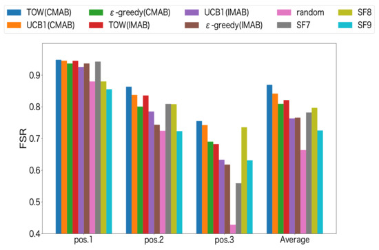 In Figure 13, we compare the FSR of all the MAB algorithm methods with the CMAB structure (CH–SF selection), the CH selection by all the MAB algorithms, and the SF selection by all the MAB algorithms. Among them, all the MAB algorithms methods with the CMAB structure are our proposed method, and the CH or SF selection by all the MAB algorithms represents the existing methods. From Figure 13, we can see that the ToW dynamics method with the CMAB structure was superior in the FSR to other methods. Figure 14 shows the performance of the FI for the MAB-based channel–SF-selection methods. The FI was used to evaluate the fairness of the LoRa devices that were deployed at Positions ➀–➂, which is expressed by the following equation: