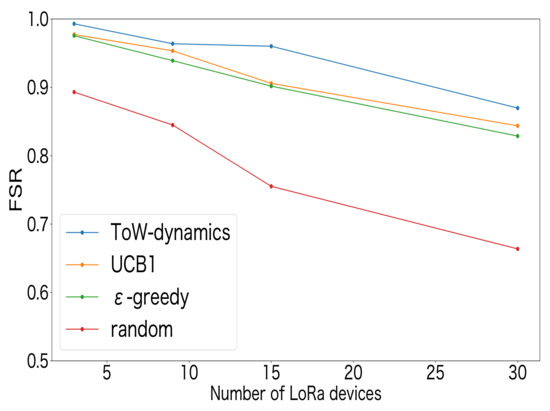 Figure 9 shows the performance in terms of the FSR for the MAB-based SF-selection methods and the random method. The number of LoRa devices was set to 3, 9, 15, and 30. The LoRa devices were deployed at each location equally, i.e., 1 device was deployed at each location when the total number of LoRa devices was 3, and 10 devices were deployed at each location when the total number of LoRa devices was 30. From Figure 9, it can be seen that the FSR decreased as the number of LoRa devices increased for all approaches. This was due to the increase in packet collisions as the number of LoRa devices increased. In addition, the MAB-based SF-selection methods can achieve a higher FSR than the random-based selection method, indicating that the distributed reinforcement learning approaches were effective. Moreover, compared to the existing studies on decentralized parameter selection using UCB1 in [27,32] and -greedy in [3], the ToW dynamics algorithm can achieve a higher FSR. A comparison of the FSR values showed that, as the number of LoRa devices increased, the difference between the ToW and the other MAB-based methods increased, which indicated that the ToW algorithm is more suitable for large-scale LoRa systems. Figure 10 shows the ratio of the SF selection at each position for the ToW-dynamics-based SF-selection method. The number of LoRa devices was set to 30 in the experiments. The results showed that a higher SF was selected by the LoRa devices farther from the GW. The reason was that the reception strength at the GW was weak for farther LoRa devices. A higher SF that could resist the noise was selected to guarantee successful transmission at a more-distant location with a lower receiver sensitivity and SNR threshold. In summary, the ToW-dynamics-based SF selection can select the appropriate SF for the LoRa devices deployed in different positions without prior information.