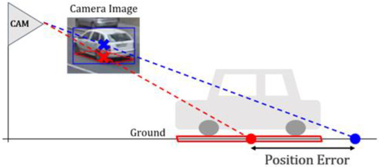 Surveillance camera-based vehicle detection has been widely used in various intelligent transportation system (ITS) applications [1,2]. In many of these, an accurate vehicle position is required [3,4,5]. For instance, autonomous driving based on vehicle-to-infrastructure (V2I) prevents accidents or control vehicles using accurate positions provided by infrastructure surveillance cameras. Various sensors have been used for vehicle detection, including monocular cameras [6,7,8,9], lidars [10,11], lidar–camera fusion [12,13], and stereo cameras [14]. Among them, monocular cameras are preferable because they can be installed at a low cost and require less computational load. In addition, widely spread existing monocular surveillance cameras can be reused for ITS applications [8]. Considering these advantages, this paper presents a method for accurately estimating the vehicle position using a monocular surveillance camera.