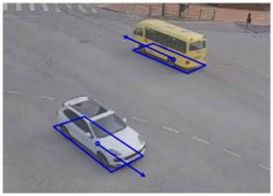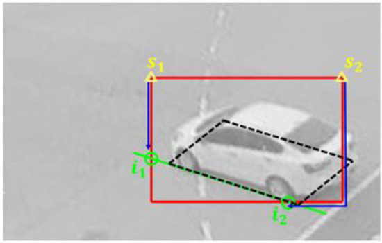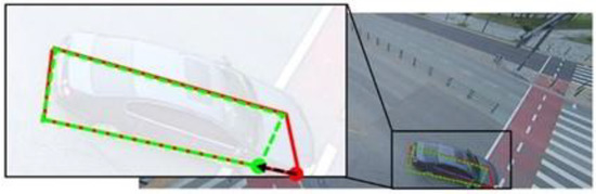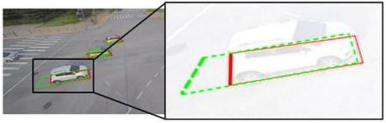Therefore, this paper focuses on detecting the BFQ to enhance vehicle position accuracy in visual surveillance environments. Although there have been some methods for detecting the vehicle BFQ using vehicle-mounted cameras, few studies have been con-ducted using surveillance cameras. For vehicle position, it is enough to estimate only the single point, the BFQ center, but the BFQ with four corners is preferred because it gives additional useful information, such as the size and direction of the vehicle, as shown in Figure 2.