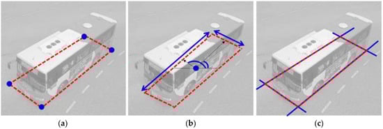Vehicle detection methods can be categorized into four approaches according to the complexity of expressing the vehicle: bounding box-based [42], bottom face quadrilateral (BFQ)-based [5], 3D bounding box-based [33], and wire frame-based [43]. Since this paper deals with the BFQ-based approach that provides the vehicle’s position, size, and direction while requiring less computation, the detailed related literature has been reviewed only for this approach. The methods in the BFQ-based approaches can be classified into three methods: corner-based, position/size/angle (PSA)-based, and line-based. Figure 3 shows brief descriptions of these three approaches. The BFQ, which is the detection target, is shown in red. The blue features represent what each approach finds to detect the BFQ. All three approaches detect the BFQ by finding the four corners, the position/size/angle, and the four lines of the BFQ, respectively.