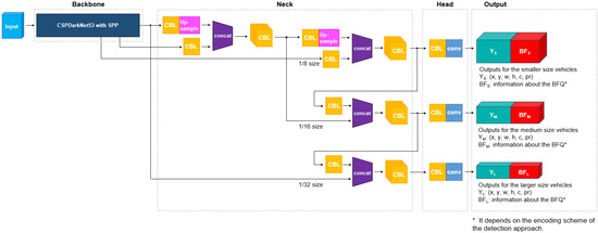 YOLO is one of the most widely used one-stage detectors used in various fields such as traffic surveillance [48,49], autonomous driving [50,51], unmanned aerial vehicles [52,53], and robotics [54]. Among several YOLO variants, YOLOv4 was selected in this paper because it has been proven for a considerable time in a variety of applications and has demonstrated a compromise between detection accuracy and computational cost in various frameworks [55,56]. The vehicle BFQ detectors are implemented by adding extra heads to YOLOv4, as shown in Figure 4. The extra heads for the BFQ detection are represented as red BF blocks, which are added to the Y blocks for vehicle detection. Except for the BF blocks (red blocks), the structure is the same as that of YOLOv4, which consists of the backbone, the neck, and the head. The backbone is CSPDarkNet53 [57] with a spatial pyramid pooling (SPP) module [58] and trained on the COCO dataset [59]. The neck of the network consists of convolution (C), batch normalization (B), leaky ReLU (L), up-sampling, and concatenation modules. Most layers use the first three modules together, but only the last layer of the head uses a convolution. The combination of the three modules (convolution, batch normalization, and leaky ReLU) is denoted as CBL in Figure 4. The up-sampling and concatenation modules are used twice and four times to create multi-scale feature maps. The network takes a color image as an input and produces three feature maps with different scales as outputs. YS + BFS, YM + BFM, and YL + BFL denote the three output feature maps in Figure 4. Y and BF include information on bounding boxes and BFQs, respectively, and subscripts S, M, and L indicate their scales. The sizes of the output feature maps are 1/8, 1/16, and 1/32 of the input image size, respectively. The output feature map for the bounding box (Y) is the same as that of YOLOv4, including the position and size of the bounding box, the confidence score, and the class. The output feature map for the BFQ (BF) depends on the encoding scheme of the BFQ detection approach. Details are given in the following sections.