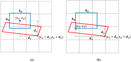 The vehicle BFQ has four corners, and their positions in the image are represented as the sum of an origin coordinate and an offset. Therefore, detecting the corner is equivalent to estimating the offset from the predefined origin to the corner. The origin can be determined in various ways, but in this paper, two methods are applied by referring to the existing methods [20,21,22,23]. The offsets are also encoded in two ways. Thus, the total number of combinations of origin and offset is four. Figure 5a,b are cases where the origin (,) is defined differently. In Figure 5, the red quadrilateral represents the vehicle BFQ, and the blue rectangle represents the anchor box of the size . The anchor boxes are the same as those in YOLOv4, where nine anchor boxes are used (three for each scale). The anchor boxes were selected by applying k-means clustering to the sizes of the objects in the COCO dataset. Figure 5a is the case where the center of the anchor box is defined as the origin, and Figure 5b is the case where the lower left corner of the anchor box is defined as the origin. As you can see in this figure, a corner coordinate of the BFQ is far from the origin by the offset (,). The offsets are encoded in two ways using the anchor box size: