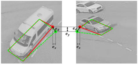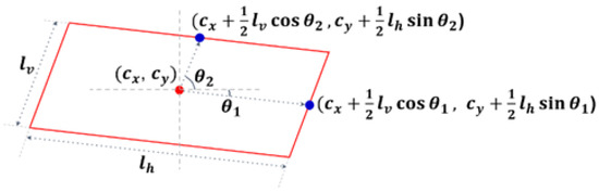 Figure 6 shows a vehicle BFQ represented by the position, size, and angle. In this figure, the red parallelogram of size is the BFQ, and the red dot is its center . The center is detected by the C2 method, which is a method of the corner-based approach. The size of the BFQ is equal to the length of the two sides, and , of the parallelogram in Figure 6. The size is encoded using the anchor box size as: