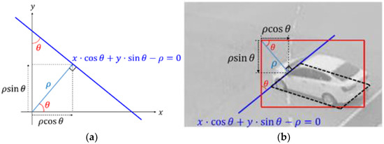 A straight line can be expressed by the normal form of a linear equation. As shown in Figure 7a, if the blue line has a positive angle with the x-axis and a normal distance from the origin s, its linear equation is . In the same way, the four lines of the BFQ can be written as four linear equations. Figure 7b shows how one side of the BFQ is expressed as a linear equation. In this figure, the red rectangle and the black dashed quadrilateral are the bounding box and the BFQ, respectively. The blue line is the extension of one side of the BFQ. If the upper left corner of the bounding box is the same as the origin of the coordinate system, the blue line has the angle θ and the normal distance as the line in Figure 7a. As a result, the equation form of the blue line is also Therefore, the outputs of the added extra heads are four sets of and the vehicle position is finally detected by calculating the intersection of the four straight lines generated from these sets. This method is referred to as L1 in the following.