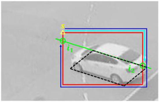 A straight line obtained by extending a line segment of the vehicle BFQ intersects the edge of the bounding box at two points. Thus, there are eight intersection points as the green circles where the BFQ lines (green lines) meet the red bounding box, as shown in Figure 8. In other words, if the two intersection points can be found on the edges of a bounding box, a straight line of the BFQ is obtained by connecting the two intersection points. The remaining lines of the BFQ are found in the same way. As shown in the figure, two adjacent lines of the BFQ intersect at one point, which is the corner of the BFQ. Therefore, the BFQ can be detected by finding the total number of eight intersection points at the edges of the bounding box.