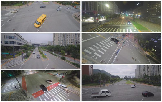 To train and test the presented methods, images captured by surveillance cameras were used. Figure 11 shows example images. It can be noticed that cameras were located at various places with different angles. The images were acquired under various lighting conditions and included multiple types of vehicles, such as sedans, vans, trucks, and buses. The training data include 6591 images with 17,249 vehicles, and the test data consist of 1622 images with 4235 vehicles. Vehicle BFQ labels were manually designated by using camera calibration results.