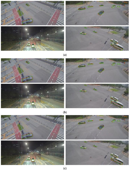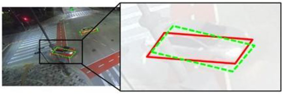 The proposed vehicle BFQ detection and the 3D vehicle detection both provide information on the vehicle’s location, direction, and size. Compared to BFQ detection, the only additional information provided by the 3D vehicle detection is the vehicle’s height. The vehicle’s height is rarely used in V2I-based autonomous driving since this application only requires the vehicle’s location, direction, and size. For the 3D vehicle detection, four points of the vehicle top face quadrilateral (TFQ) should be estimated in addition to four points of the BFQ. Therefore, the 3D vehicle detection has the following drawbacks compared to the proposed vehicle BFQ detection: (1) it requires more effort for labeling to build the dataset, (2) it increases the computational cost and network size, and (3) it degrades the detection performance because the TFQ’s shape varies a lot and does not fit the vehicle size, unlike the BFQ.