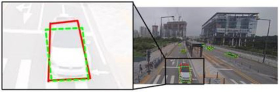 Figure 13 depicts the detection results of each approach, illustrating the remarkable differences in their performance. To provide a clear comparison, one representative method was selected for each approach, and the detection results of the selected method are shown in this figure. The red and green dashed quadrilaterals represent the ground truth and the detected BFQs by each approach. The images were taken at different times and locations, mostly on roads with intersections and varying driving directions. Despite these differences, the vehicle BFQs were successfully detected in each case. Furthermore, as shown in the right column of Figure 13, the detections were successful even when the vehicle was far away and appeared small.
