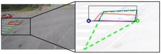 The line-based approach detects the BFQ by finding its four straight lines. The L1 method of this approach identifies the four sets of the line parameters for a single vehicle. Figure 17 shows the result when one of the 12 parameters fails to be detected. As shown in this figure, a small error in the parameter among for the left straight line can cause a significant difference in the detected BFQ from the actual one. The remaining methods of the line-based approach identify the intersection points of the bounding box with the lines of the BFQ. Specifically, the L2 method finds the edge index and the ratio for each intersection point. In Figure 18, the detected BFQ resulting from an intersection point with a misidentified edge index (green circle) differs significantly from the actual BFQ. If the edge index is correctly identified, the intersection point would have been at the blue circle, resulting in the blue dashed BFQ. Although the blue BFQ has an error, it can still be considered a correct detection. In contrast, the green BFQ cannot be considered valid because its average position error exceeds the threshold. The importance of correctly identifying the edge index for each intersection point is illustrated in Figure 18, as it restricts the intersection point’s location in this method.