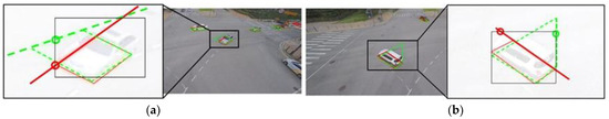 The BFQs resulting from the intersection point with the errors in the predicted ratio. The red circle, line, and quadrilateral are the intersection point, the extended line of an edge, and the BFQ of the ground truth, respectively. The green circle, line, and quadrilateral are the same as the detected BFQ. The bounding box is shown as the black rectangle: (a) result of the L2 method; and (b) result of the L3 method.