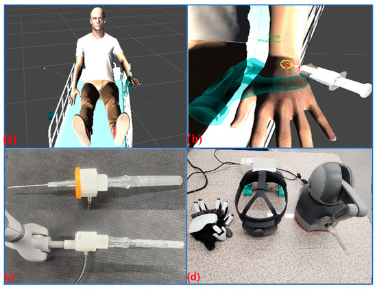 The haptic mixed reality IV simulation system (HMR-IV Sim) developed in this study consists of two major components (MR graphic rendering and haptic rendering), as seen in Figure 1. For the graphic component of mixed reality, a graphic scene composed of a human patient, a vein, and the IV needle were created as a 3D mesh model (see Figure 2a,b), which were rendered in Unity using the built-in render pipeline to provide efficient low-quality forward rendering with single pass that implements only the brightest directional light per pixel for each object when there are multiple light sources. Then, the Unity built-in shader, which is a physically based shader [19], was applied to increase the realism of interactions in the graphic rendering by adjusting the following parameters: metallic: 0; smoothness: 0.5; normal map scale: 1; specular highlights and reflection enabled. In addition, graphic rendering parameters simulating variable conditions (e.g., colors and textures of the skin and veins; vein size, shape, and location; IV needle size and blood drawing) were developed and set to allow for flexibility in programing for nursing students to practice with various conditions. These parameters were synchronized with the haptic rendering to achieve a realistic simulated environment that considers both the visual and haptic perceptions expected in real-world scenarios. For example, to control the variability of vein size and location, the graphic rendering interface was programmed to be selected at 10 mm or 7 mm for the vein diameter and 5.5 mm or 7 mm for vein location (under the skin surface). These values were informed by the literature and confirmed by clinical experts (faculty members of the Kent State University (KSU) College of Nursing).