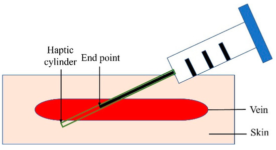 The multilayer mesh-based framework uses multiple 3D mesh objects (skin, vein, needle) at different layers to create different haptic feelings at the skin and vein layers, respectively, as graphically illustrated in Figure 4. Each mesh object was designed to have its own customized mesh collider that detects the collision of the virtual needle accurately. In addition, for the inserted needle to stay at one spot on the skin surface, we added a cylinder-shaped mesh object (Haptic cylinder in Figure 4) to the virtual needle, which haptically guides a penetration path determined by the initial insertion angle on the skin and mimics a realistic insertion feeling created by the inner layer of the skin. The resisting force of the haptic cylinder object is computed only when the end point of virtual needle is moved into the skin surface, which is detected by the position sensor of Geomagic Touch (3D Systems Inc., Santa Clarita Valencia, CA, USA). The resisting force is optimized by stiffness and friction. Once the haptic cylinder is activated, the needle is not able to break the collider of the cylinder until the end of insertion. Insertion feedback forces were computed using the virtual proxy model [24,25] implemented in the OpenHaptics library with adjustments to provided haptic rendering parameters (stiffness, friction, pop-through).
