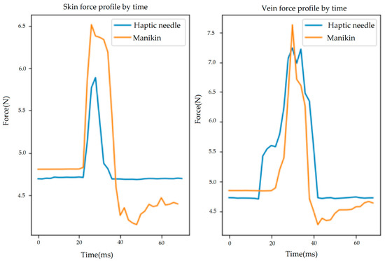 Force profiles recorded with a manikin arm and our haptic needle insertion simulation system for the skin and vein, respectively. These pairs exhibit the best similarity results, proven by the highest correlation coefficients (Left: 0.9511; Right: 0.8762). Although the gap between the two force profiles (insertion into a virtual vein using the haptic needle vs. insertion into a real manikin arm) looks large in such a high-definition force dimension, it was perceptually acceptable and confirmed by experts (nursing faculty) as the most realistic insertion feeling.