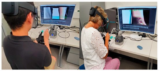 The HMR-IV insertion simulation system developed with a 64-bit Windows desktop PC (Intel® core™ i7-9900K CPU from Intel, Santa Clara, CA, USA, 32 G RAM, and a NVIDIA RTX 2070), a Geomegic Touch haptic device (right hand), a Dexmo haptic glove (left hand), and Microsoft HoloLens 2 were used for this evaluation study, as seen in Figure 6. A 32” PC monitor was used only for monitoring the experiment.