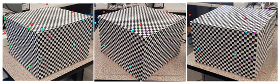 Calibration checkerboard box with virtual feature points captured by HoloLens 2 camera at three different viewing angles (−45, 0, 45 degrees). Each color of the virtual feature points demonstrates the point from same side of the box.