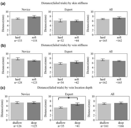 Analytic data comparing failure trials in terms of two variabilities (haptic stiffness for the skin and vein and vein location depth). For each figure, n is the failed attempts, and the vertical axis is the distance measured from the vein center to the needle end tip (* p < 0.05).