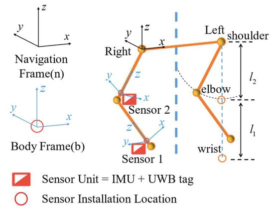 In this section, the proposed information fusion algorithm for human upper limb motion estimation is described. As shown in Figure 1, we first simplified the human upper limb as a kinematics model with three joints (shoulder, elbow, and wrist) and two segments (upper arm and forearm) [21]. The shoulder joint was set as a fixed point with three degrees of freedom (DoFs) and two DoFs for the elbow and wrist [37]. Taking the right arm as an example, two IMU sensors were arranged on the lateral side above the wrist and the elbow, respectively, as well as two UWB tags. The navigation coordinate frame (n) was set as the reference system, which was consistent with the coordinate system of UWB and MoCap. The body frame (b) was attached to each body segment where the sensors were located. It aligned with the n-frame initially. Neglecting the installation errors, the sensor frame (s) was attached to each IMU and aligned with the b-frame to track the movements of human upper limbs.