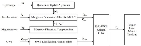 The overall framework of the proposed algorithm consists of three parts, illustrated in Figure 2, including (1) Quaternion RK4 Based Madgwick Orientation Complementary Filter, (2) UWB localization Kalman filter, and (3) IMU/UWB Fusion Kalman filter. For the purpose of estimating the 3-D spatial trajectory of the movements of human upper limbs, we first employed the quaternion method to calculate the attitude angle using gyroscope measurements. However, the integration of gyroscope measurement errors contributed to an accumulating error in the quaternion algorithm [14]. Therefore, we considered adopting the Madgwick orientation filter to improve the motion estimation accuracy through the optimal fusion of the accelerometer, gyroscope, and magnetometer of the MARG system. Then, in order to further reduce the drift error, we proposed that the UWB localization system be combined with the IMU sensors. An extended Kalman filter was utilized to fuse IMU and UWB in order to perform stable and high-precision motion estimation of the human upper limbs.