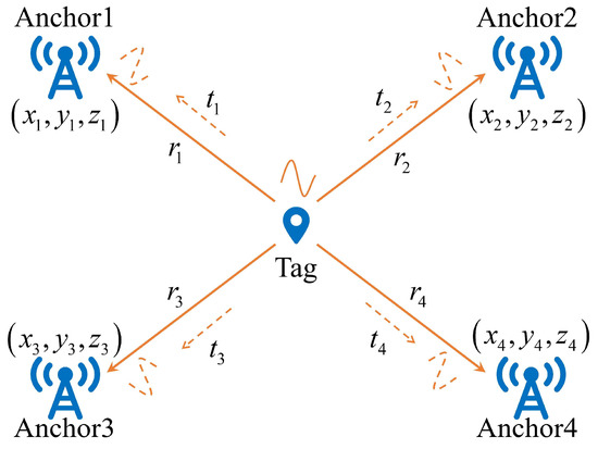 The UWB positioning system contained a tag-anchor wireless communication channel, as shown in Figure 3. The calculation of the distances between each tag and anchor exploiting double-sided two-way ranging (DS-TWR) method and position estimation employed distances [28,29]. In addition to classical UWB positioning algorithms such as MLE, LLSE, and WCE, we used EKF for position estimation due to its lower complexity and shorter computational time [29].