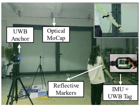 Setup of IMU sensors, UWB system, and optical MoCap system.
