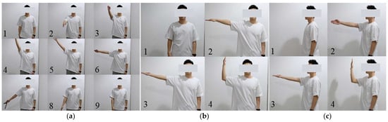 Our experiments aimed to capture several common movements of the human upper limbs, including simple whole-arm movements and combined upper-arm and forearm movements. These common movements comprised motion 1: shoulder flexion/extension and abduction/adduction (the whole arm moving along a circular trajectory); motion 2: shoulder abduction/adduction, internal/external rotation, and elbow flexion/extension; and motion 3: shoulder flexion/extension, internal/external rotation, and elbow flexion/extension, as shown in Figure 6. In each trial, one type of movement was performed periodically, with a duration of about one minute.