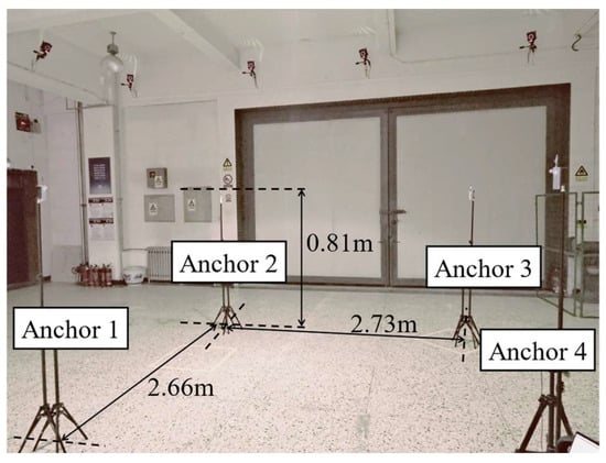 Additionally, a DW1000 UWB real-time localization system manufactured by Haoru Technology, Dalian, China, was employed to track the 3-D position with an update rate of about 10 Hz. The UWB communication technology was implemented between the anchors and tags through the DS-TWR method based on time-domain transmission of radio signals, and the anchors were also connected to the computer via a serial port module. It provided an accuracy of 10 cm for the X/Y axis and 30 cm for the Z axis. Two UWB tags were fixed on the bracelets with the IMU sensors to avoid relative movement, as shown in Figure 5. To ensure the positioning stability of UWB, four anchors were arranged in our laboratory in a cube distribution.