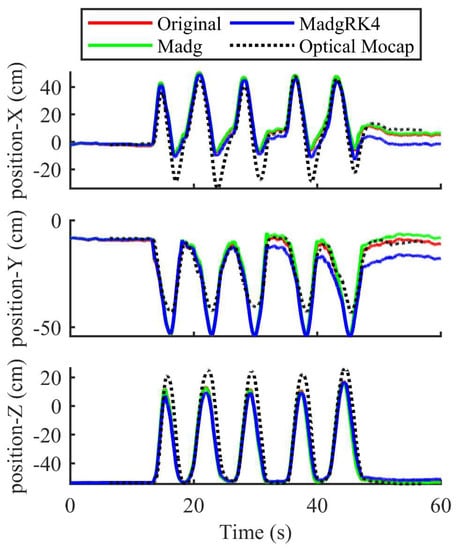 The position accuracies of the three kinds of movements are summarized in Table 1. It shows the 3-D position accuracy of forearm motion tracking by the fourth-order Runge–Kutta Madgwick method and the original second-order update algorithm compared with the optical Mocap system. According to Table 1, the root mean square error (RMSE) values of tri-axis motion tracking of Madgwick RK4 method varied from 6.17 cm to 12.76 cm, which shows the feasibility of precise motion tracking of the human upper limbs. In order to further reduce the error, it is necessary to utilize the UWB measurements.
