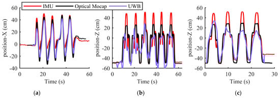 Comparison of the sensor unit 1 position of upper limb motion tracking for three kinds of movements by the IMU, UWB, and optical Mocap systems: (a–c) represent motion 1, motion 2, and motion 3, respectively.