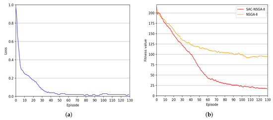 Algorithm convergence of SAC-NSGA-II: (a) Learning curve of SAC-NSGA-II. (b) Comparison of fitness curves.
