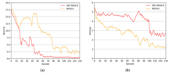 Regarding the learning curves in Figure 4a,b, the rapid decrease in and maintenance of spacing values within a small range after the implementation of SAC-NSGA-II indicate the effectiveness of the proposed approach in enhancing population uniformity. This suggests that SAC, as an additional component, contributes to improving diversity preservation compared to the standard NSGA-II algorithm. The ability to maintain better population entropy measures over a wider range during the iterative process further supports the conclusion that SAC-NSGA-II can effectively enhance population diversity.