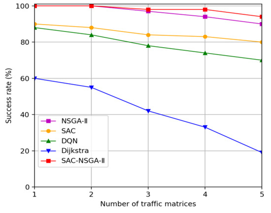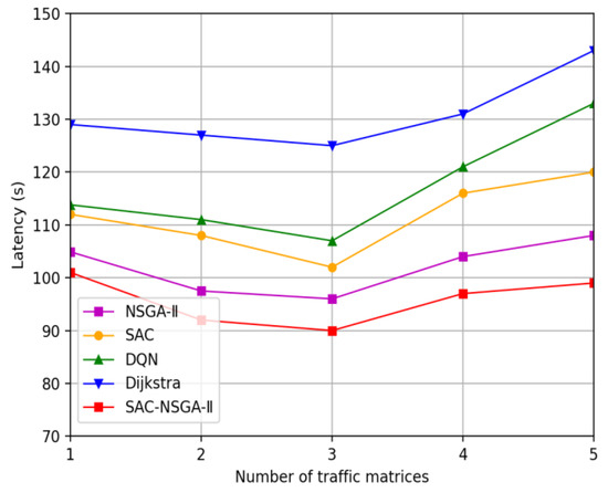 Moreover, when the number of traffic matrices increases to five, the maximum service delay reaches 99.4 s. This is 9.6 s slower than the second-best NSGA-II algorithm. This indicates that the SAC-NSGA-II algorithm performs better in managing the increasing traffic load than other algorithms.