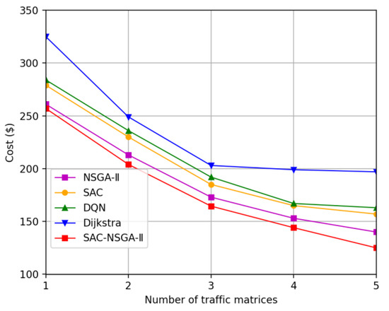When the number of input traffic matrices exceeds three, the bandwidth utilized by a single user exceeds the maximum transmission bandwidth, leading to link congestion. In such situations, SAC, DQN, NSGA-II, and SAC-NSGA-II prioritize routing low-cost services, with SAC-NSGA-II exhibiting the lowest cost among them.